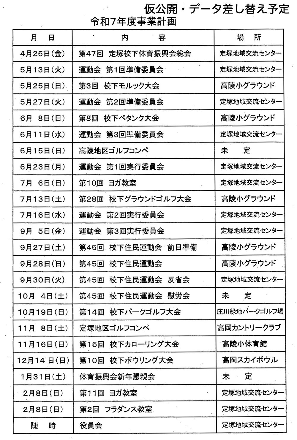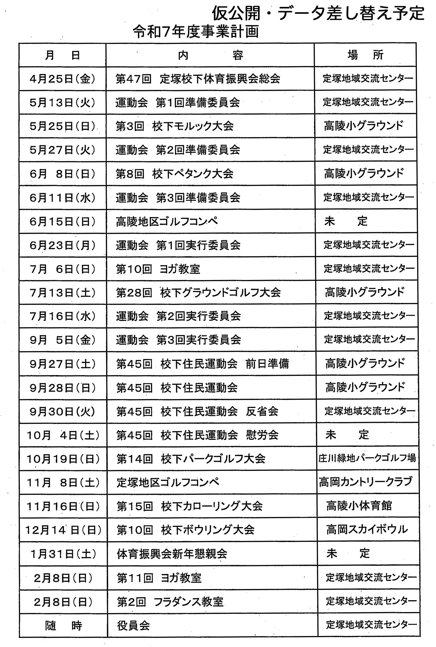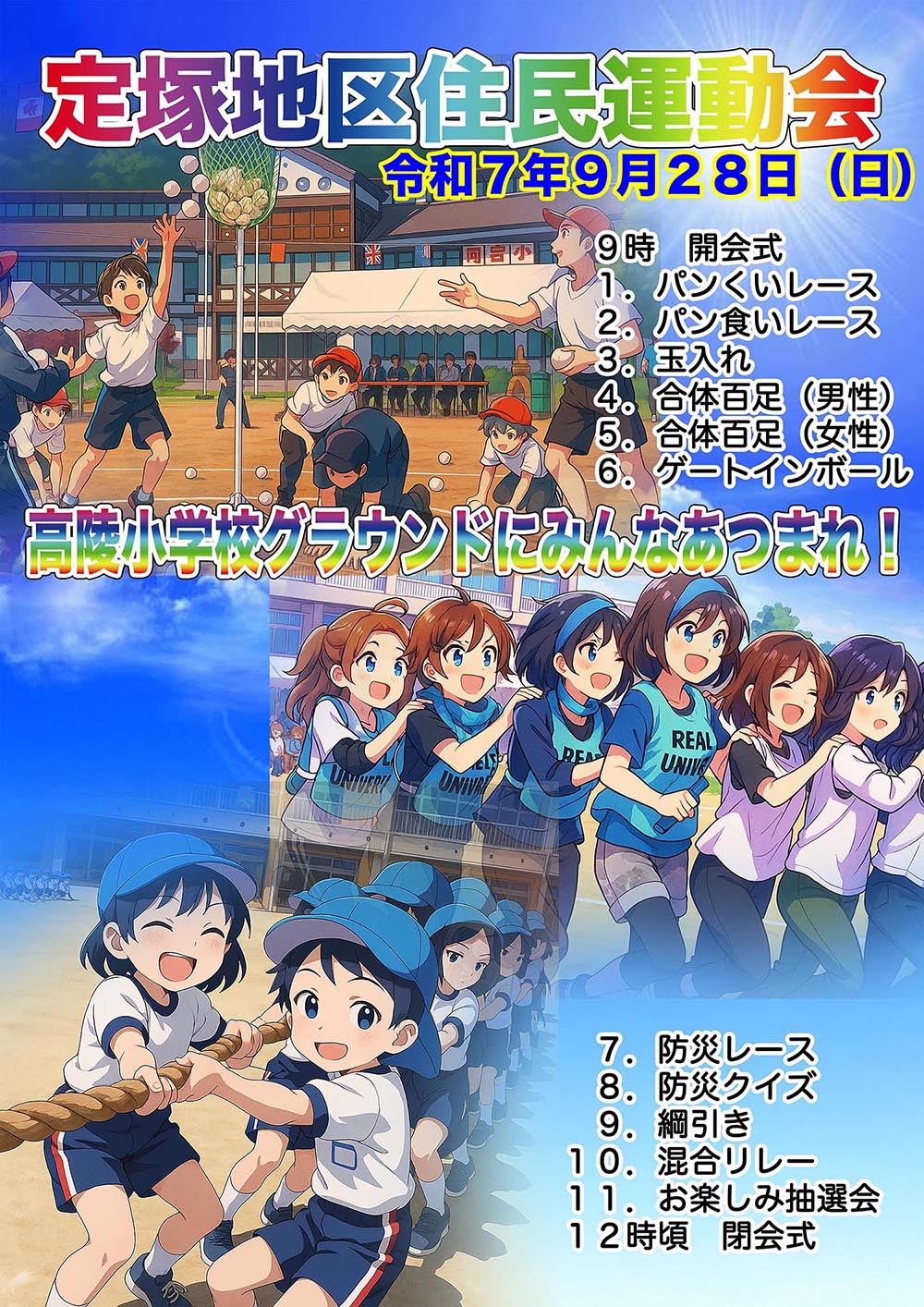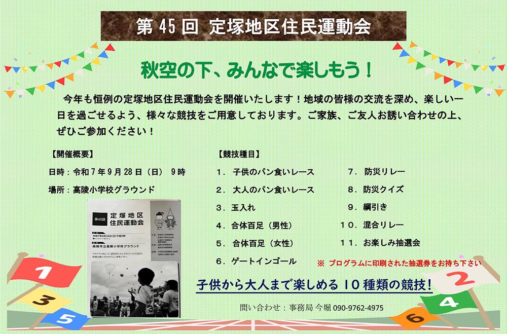 令和7年9月28日(日)秋晴れのもと、高陵小学校グラウンドで「定塚地区住民運動会」が開催されました。全10種目が行われ、子どもから大人まで笑顔いっぱいの一日となりました。リレーでは各チームが真剣勝負を繰り広げ、会場は大いに盛り上がりました。最後にはお楽しみ抽選会も行われ、歓声と笑顔があふれる楽しい運動会となりました。
